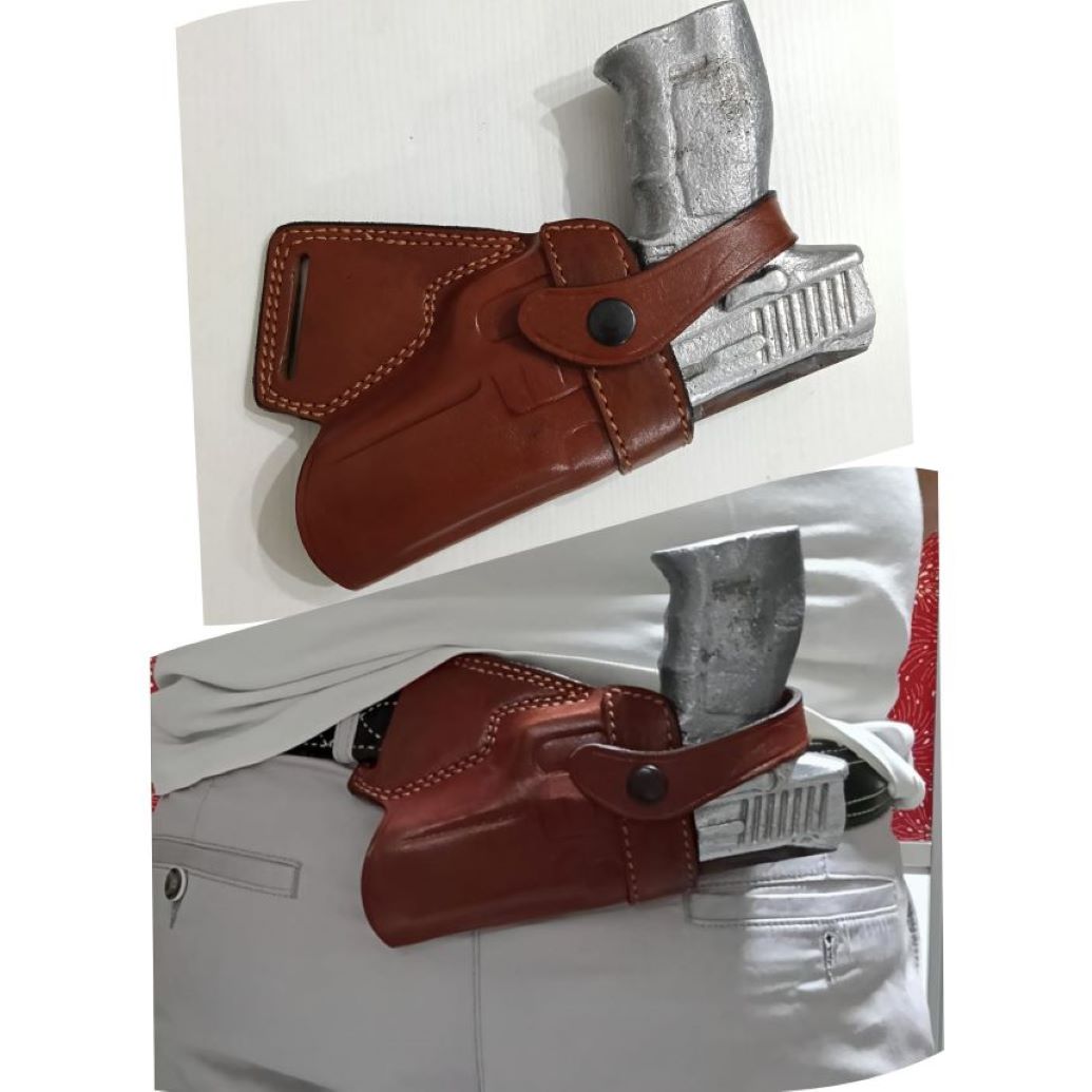 Hakiki dana derisinden el işçliği ile üretilmiştir. bel arkası kısıma kuyruk sokumun geldği yere takılır kemer geçme kanalı 4 cm dir çııçıtlu kuşaklıdır ucu açıktır namlu dışarı çıkmaz sağ el kullanımdır sol l için msş yolu ile orabilisiniz. Silahkilifidunyasi tarfandan imal edilmiştir.